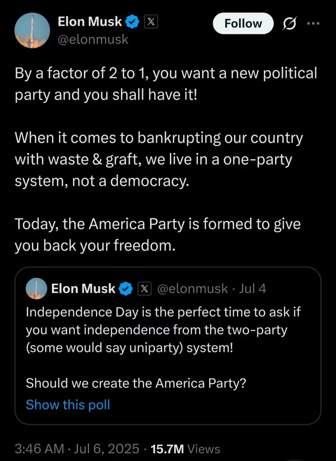 Responding to the results on Saturday, Musk wrote, "By a factor of 2 to 1, you want a new political party and you shall have it! When it comes to bankrupting our country with waste & graft, we live in a one-party system, not a democracy."