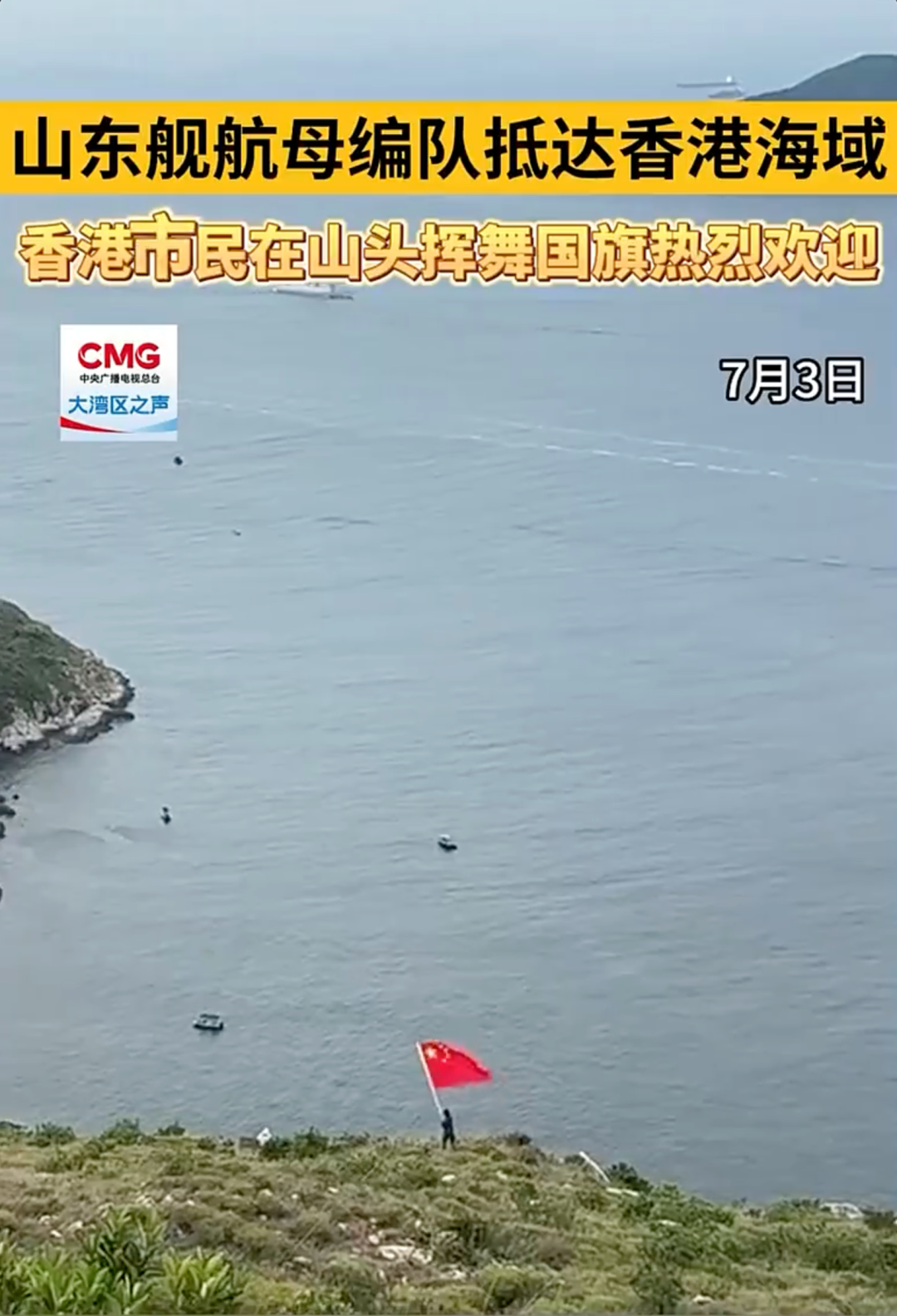 7月3日上午8时许,编队缓缓驶入维多利亚湾,身着白色军装的山东舰官兵在飞行甲板上摆出了“国安家好”的字样,向香港同胞送去独具海军特色的祝福。