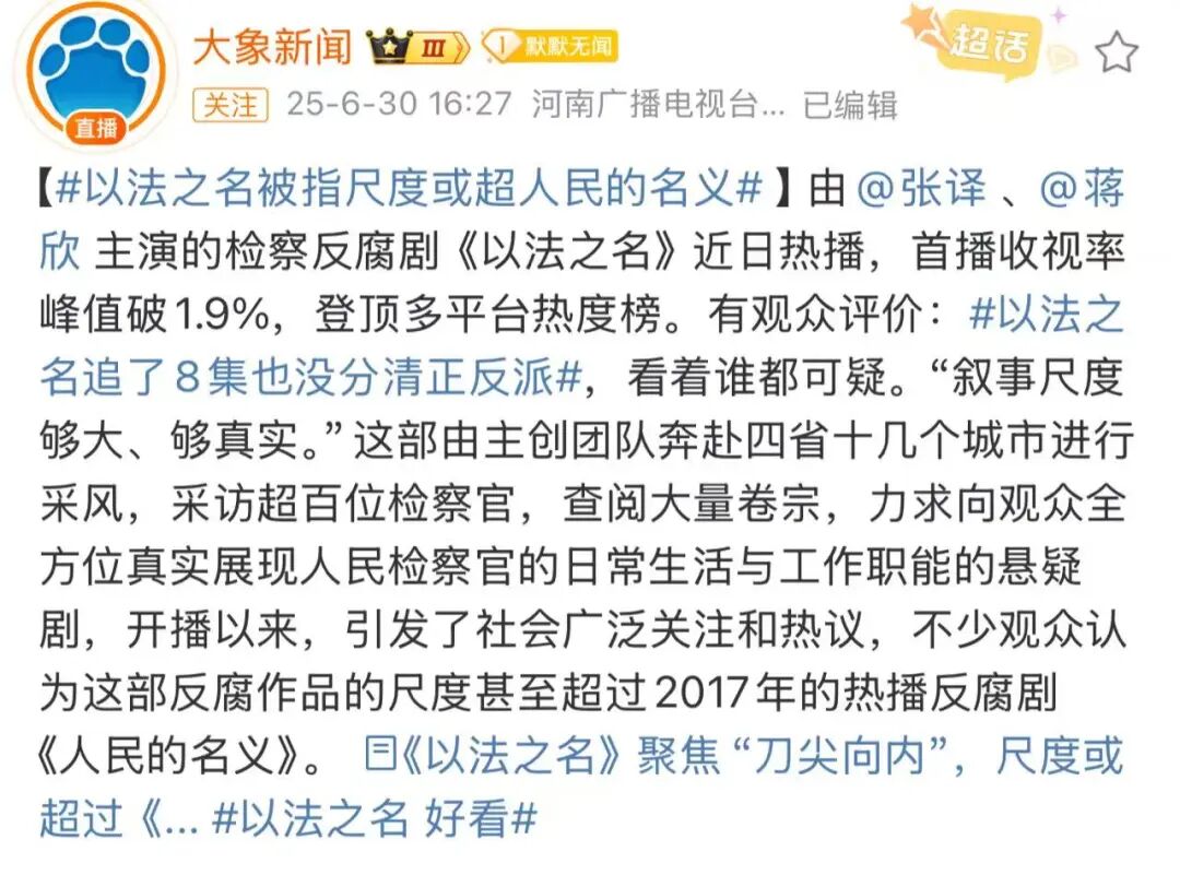 然而,随着该剧迎来大结局,有关“《以法之名》 烂尾”的讨论,冲上微博热搜。
