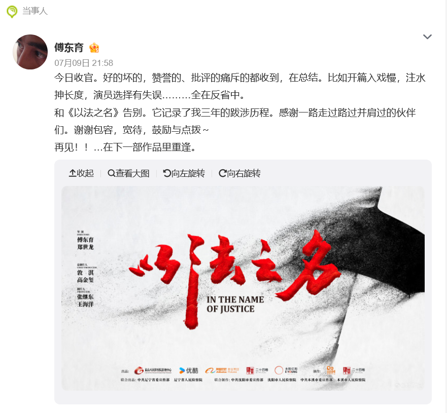收官当晚,该剧导演傅东育发文:“今日收官。好的坏的,赞誉的、批评的痛斥的都收到,在总结。比如开篇入戏慢,注水抻长度,演员选择有失误……全在反省中。和《以法之名》告别。它记录了我三年的跋涉历程。感谢一路走过路过并肩过的伙伴们。谢谢包容,宽待,鼓励与点拨~再见!在下一部作品里重逢。”