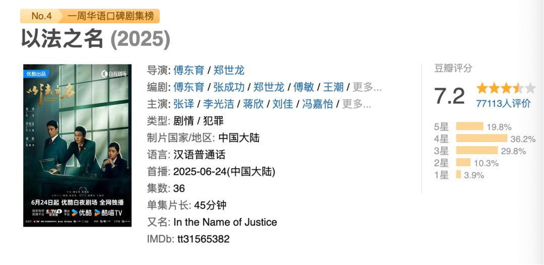 截至目前,《以法之名》在豆瓣评分为7.2分,超7万人打分,并入选了豆瓣“一周华语口碑剧集榜”。