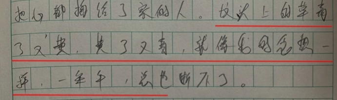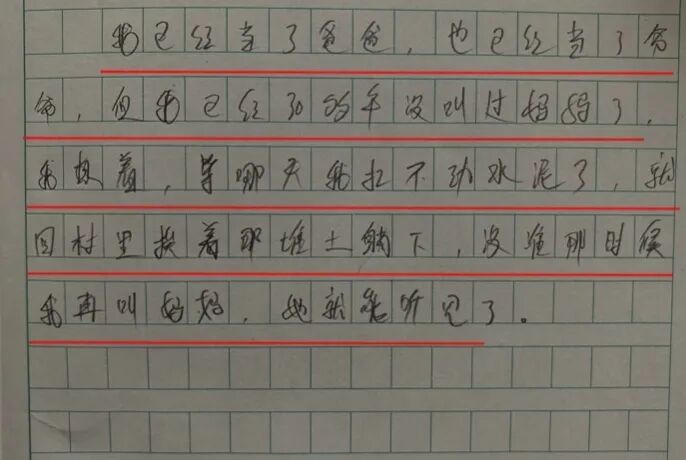 他在这篇作文中写道:“坟头上的草青了又黄,黄了又青,就像我的念想一样,一年年,总也断不了。我已经当了爸爸,又已经当了爷爷,但我已经三十多年没叫过妈妈了。我想着,等哪天我扛不动水泥了,就回村里挨着那堆土躺下,没准那时候,我再叫妈妈,她就能听见了。”