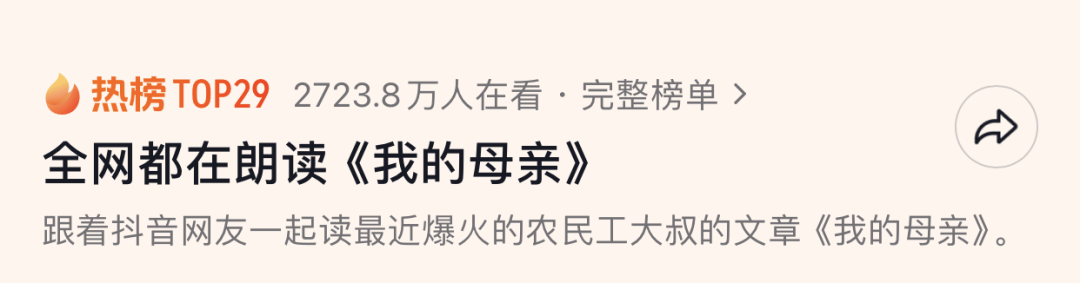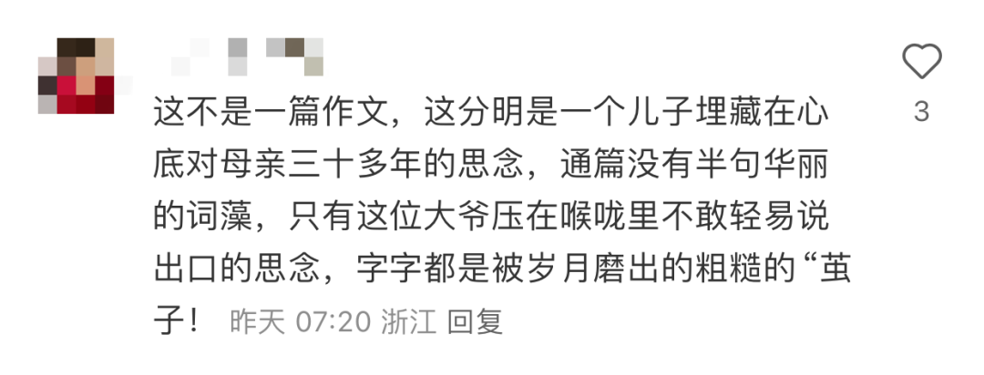 这篇文字朴实的作文,一下子打动了网友。据光明网报道,视频发布仅48小时,点赞量便突破500万次,评论区瞬间涌入十多万条留言。话题“全网都在朗读《我的母亲》”一度登上平台热搜。