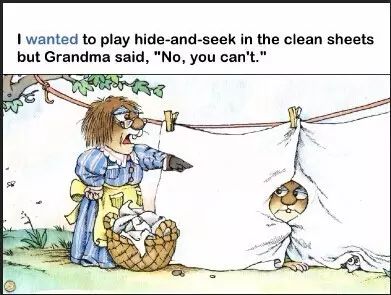 我想在洗干净的床单下面玩捉迷藏但是奶奶说,“不行,你不能这么做。”