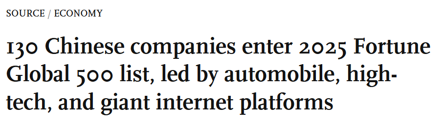 下面我们一起来看《Global Times》的这篇报道,标题是:130 Chinese companies enter 2025 Fortune Global 500 list, led by automobile, high-tech, and giant internet platforms。