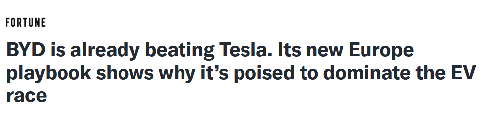 值得一提的是,据《财富》杂志另一份报告显示,比亚迪在电动汽车竞赛中已超越特斯拉,并在欧洲市场与大众汽车展开竞争。