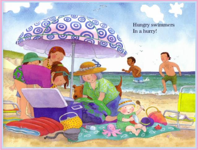 饥肠辘辘的游泳者们匆忙的上了岸!