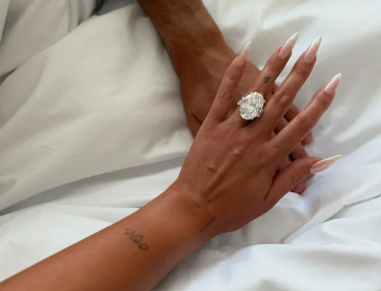 乔治娜在Instagram上发布了一张他们把手放在床上的照片,她的手指上戴着一枚巨大的钻戒,并配文:“是的,我愿意。不止于此,更是一辈子。”