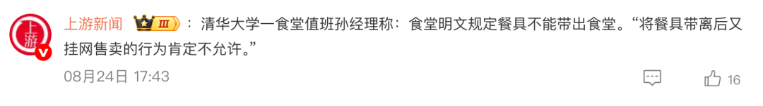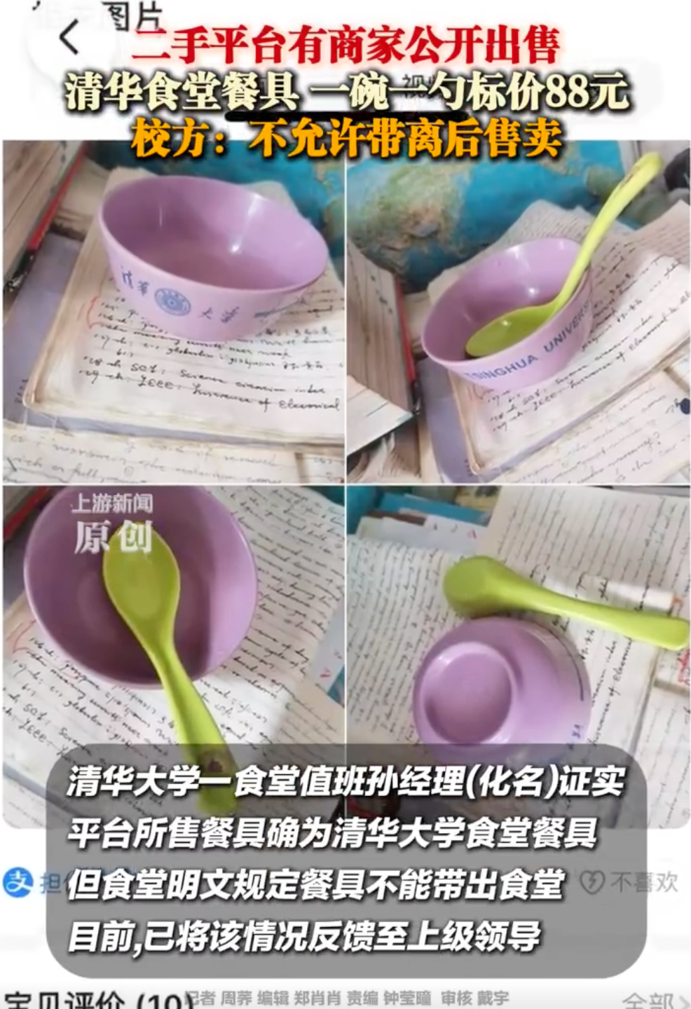 对此,清华大学一食堂值班孙经理(化名)证实,二手平台所售餐具确为清华大学食堂使用的正规餐具。食堂明文规定餐具不能带出食堂,“将餐具带离后又挂网售卖的行为肯定不允许。”食堂已将该情况反馈至上级领导及保卫处,后续将跟进处理。