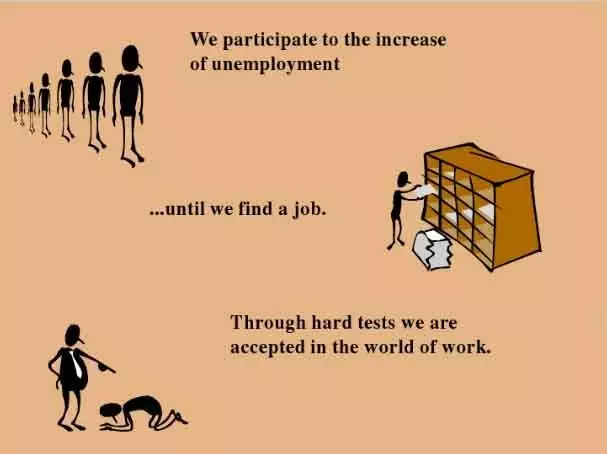 我们一毕业就面临失业,找不到工作就不停的面试。 Through hard tests we are accepted in the world of work.