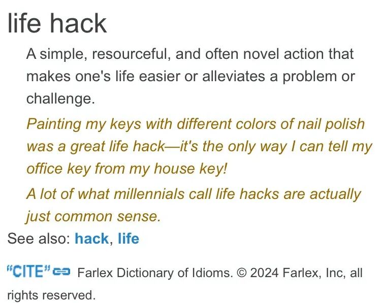 A simple, resourceful, and often novel action that makes one's life easier or alleviates a problem or challenge.