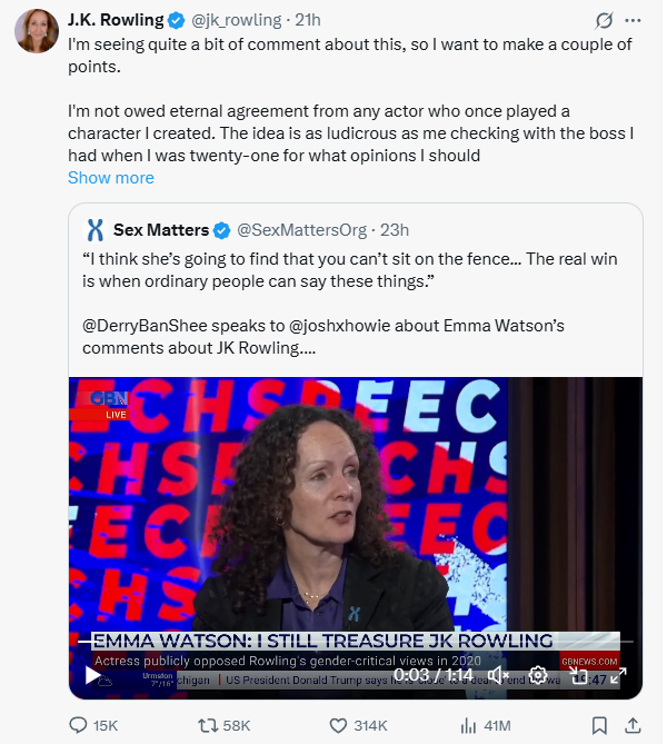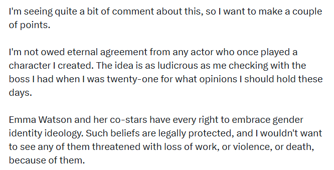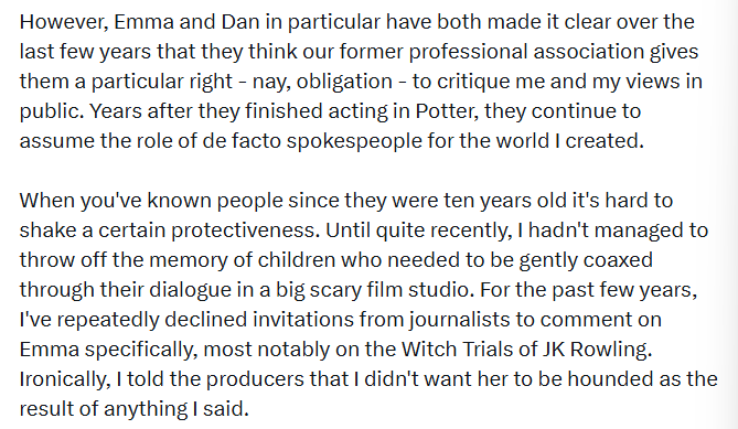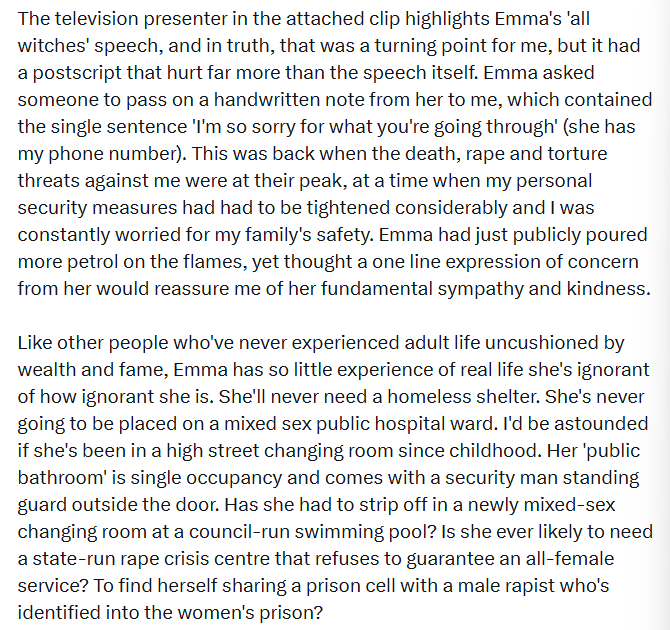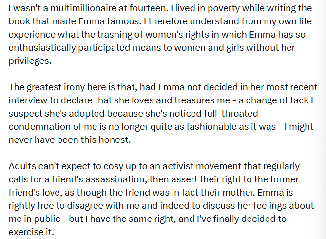 This was back when the death, rape and torture threats against Rowling were at their peak, “Emma had just publicly poured more petrol on the flames, yet thought a one line expression of concern from her would reassure me of her fundamental sympathy and kindness,” Rowling wrote.