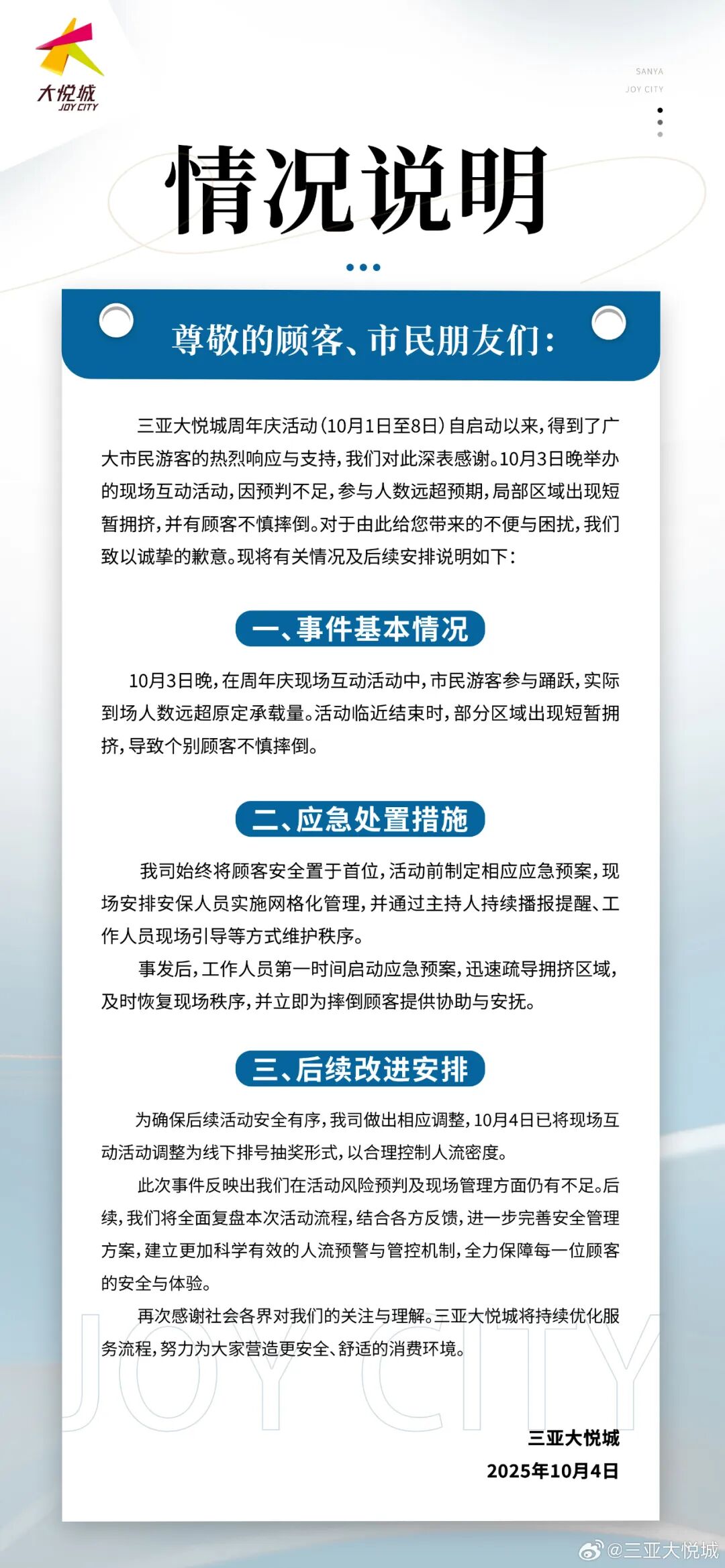 4日晚10时许,@三亚大悦城 发布“情况通报”称,3日晚举办的现场互动活动,因预判不足,参与人数远超预期,局部区域出现短时拥挤,并有顾客不慎摔倒。“对于由此给您带来的不便与困扰,我们致以诚挚的歉意。”