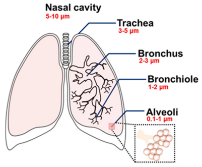 图示:不同气道区域会截留不同的纳米颗粒(NPs),这显示出纳米颗粒的沉积具有尺寸依赖性。微米级颗粒主要滞留于上呼吸道区域,而更小的颗粒则可到达肺部最深区域(肺泡)。