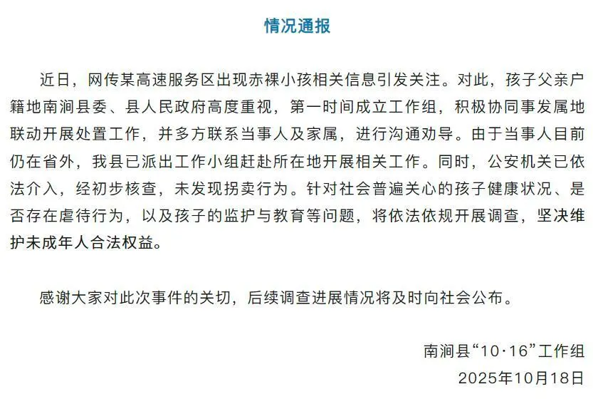 10月18日,南涧县“10·16”工作组发布情况通报称,公安机关已依法介入,经初步核查,未发现拐卖行为。