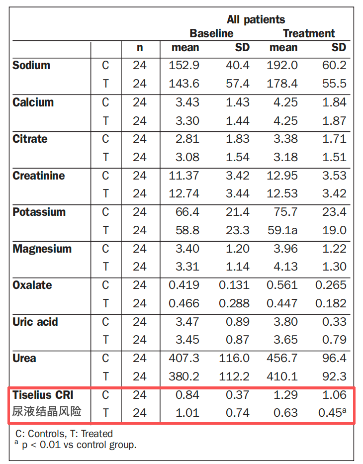 结果发现:治疗组的尿液结晶风险指数得到显著改善,从 1.01 下降到 0.63,其中男性尿液结晶风险指数下降 33.9%,女性下降 44.8%。