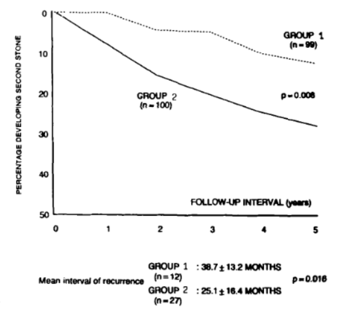 ● 干预组平均复发率约为 12.1%,而没有大量饮水的对照组复发率高达 27%。