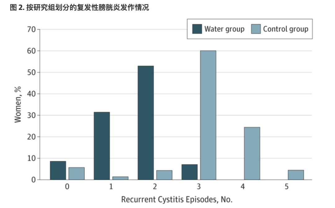 ● 喝水组中 93% 患者尿路感染发作次数 ≤ 2 次,而非水组中 88% 患者尿路感染发作次数 ≥ 3 次。