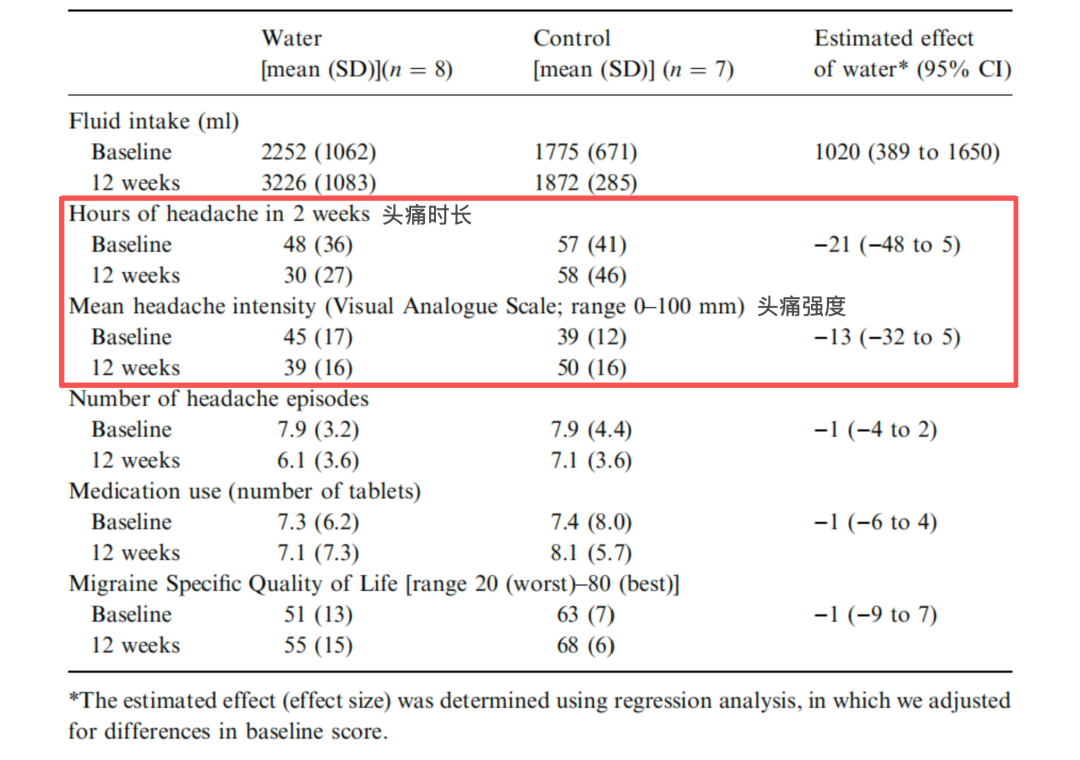 一项针对患有原发性复发性头痛患者的研究发现,每天多喝 1.5 升水,持续 3 个月后,47% 患者报告有显著改善效果,而这一比例在对照组中仅有 25%。[8]