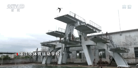 湛江体校的训练条件简陋,跳台是水泥砌的,侧面由于长期发霉,已然变黑。跳板被踩动时,会发出“咯吱咯吱”的响声,仿佛年久失修一般。就连泳池里的水也有些发绿、发黑,根本看不见底。