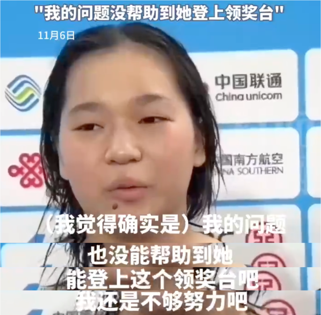 赛后,全红婵面对镜头自责道:“我觉得确实是我的问题,没能帮助到我的队友登上领奖台,我还是不够努力吧。”