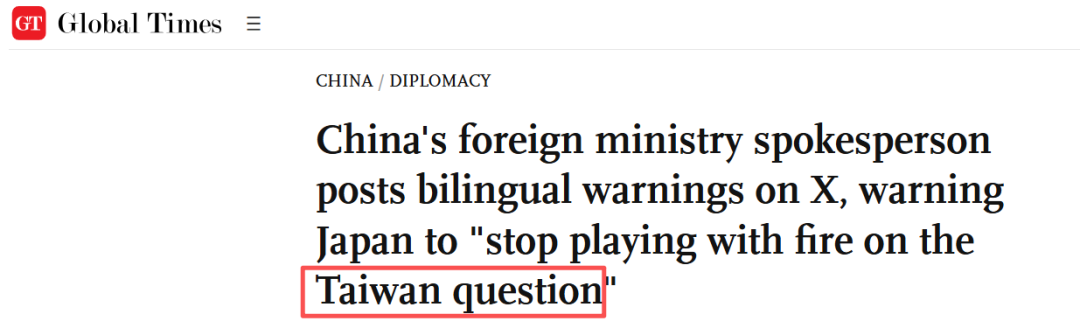 中国军方媒体账号 “中国军号” 周四晚间转发了两张外交部发布的图文。其中一张写道:“如果日本敢插手两岸局势,那将是一种侵略行为,肯定会遭到中国的坚决回应。”另一张写道:“日本必须停止在台湾问题上玩火。玩火者必自焚!”