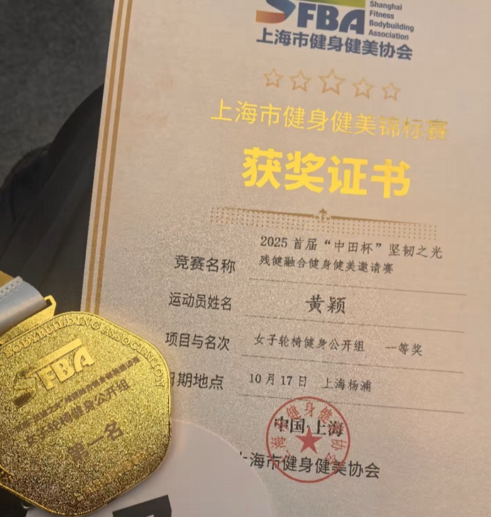 In mid-October, Huang went to Shanghai to participate in a bodybuilding competition and won first place in the women's wheelchair category.