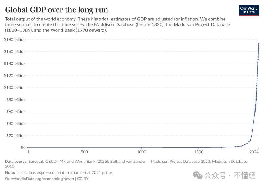 如果我们看一下过去两千年全球GDP的图表,会发现一条漫长而平坦的死线,然后直到最近两三百年才突然像火箭一样垂直升起。
