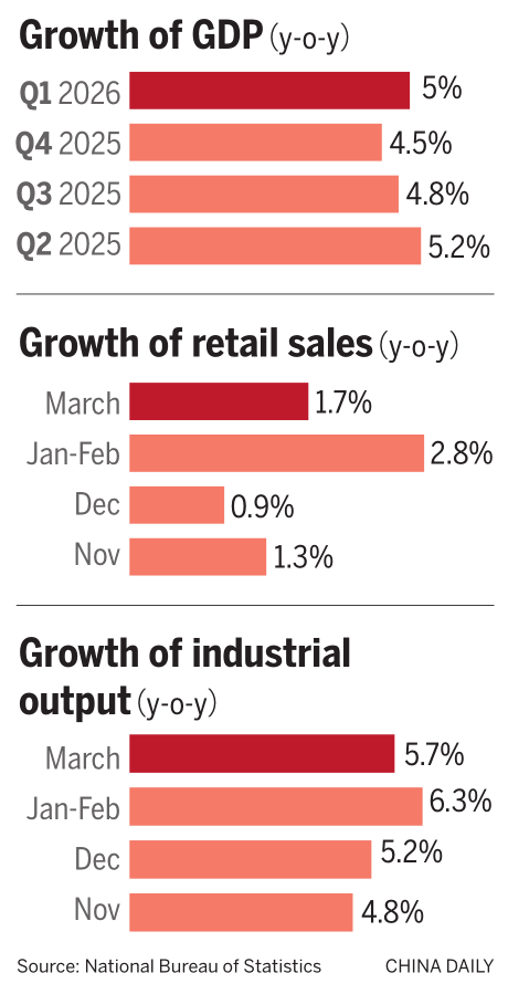 Given that the first-quarter growth has laid the foundation for achieving China's annual GDP target of 4.5 to 5 percent, analysts said the likelihood of launching significant easing measures such as interest rate cuts is low in the near term, especially as rising international oil prices continue to feed through into the domestic market.