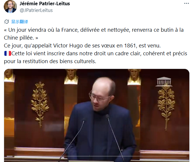 French MP Jérémie Patrier-Leitus shared a video of his speech on social media, referencing the famous dream of French literary giant Victor Hugo: “I hope that one day, a liberated and clean France will return these spoils to the plundered China.” His words reveal a pursuit of historical justice and an anticipation for future efforts in artifact restitution. France’s newly appointed Minister of Culture, Catherine Pégard, stated that the world is watching this legislation, which she believes opens a new chapter in history and can heal the wounds of historical memory. The law aims to provide a clear framework for future restitution and improve efficiency; from now on, returns will proceed through administrative decrees rather than legislative procedures, simplifying the process.