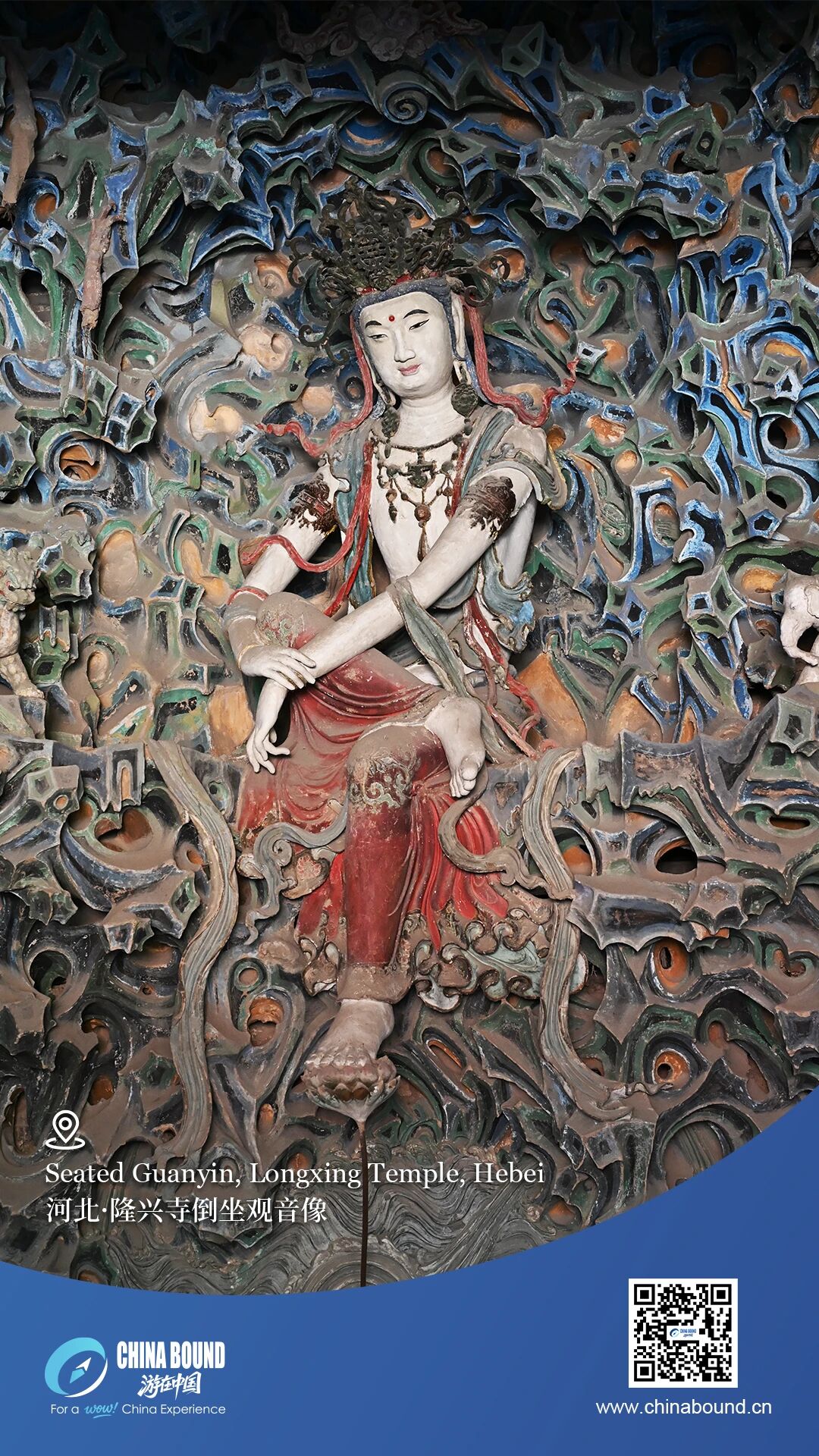 Inside its main hall, the serene "Backward-Seated Avalokitesvara (Guanyin)" rests gracefully, surrounded by hanging sculptures like drifting clouds — capturing compassion, movement, and the refined elegance of ancient Chinese artistry in a single, timeless moment.