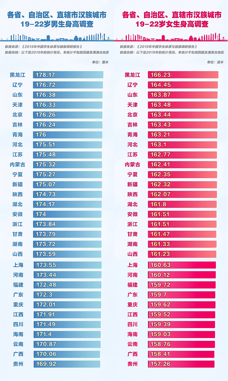 其次,我们来看看这几个“吃辣大省”人民的身高水平分布,结合《2019年中国学生体质与健康调研报告》来看,江西、湖南、贵州的平均身高在全国确实是处于中下游位置的,但这背后更主要的是遗传、环境、营养、经济等多种因素共同作用的结果,不能简单归因于吃辣。