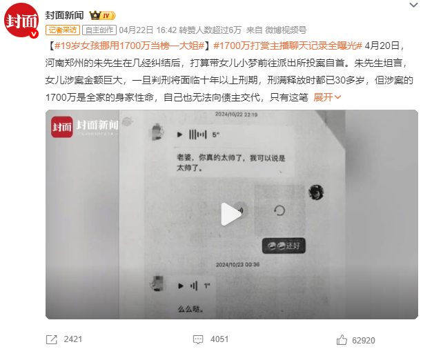 据封面新闻报道,河南郑州一19岁女孩挪用父亲公司资金用于直播间打赏,前后共消费1700万元。