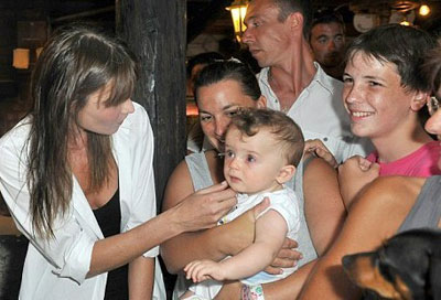 Nicolas is planning a three week break with Carla, who wore a colour co-ordinated white shirt and jeans as they posed with locals while taking a stroll together.