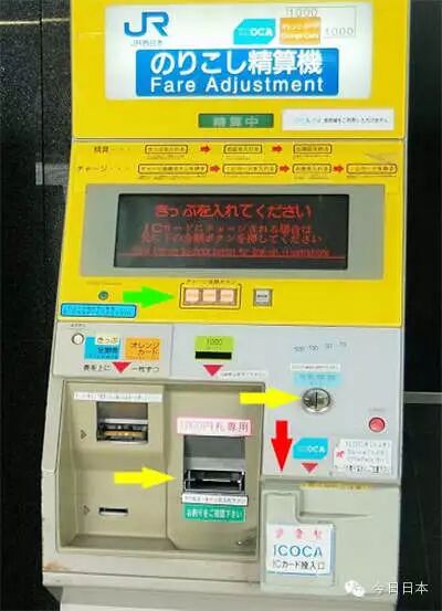 退卡手续费:¥210说明:退卡时,若卡片还有馀额,就会扣除¥210的手续费后,再加上¥500的押金还你。若余额低于¥210时,则只会退还¥500。(换言之,若你用到光,去退卡,他们也会还给你¥500)8)ICOCA卡储值方法(当卡里的钱用完时在哪里储值?)方法一:插入ICOCA (下图红色箭头)选择储值金额(绿色箭头)投入适当金额(黄色箭头,分别有零钱及纸钞投入口)