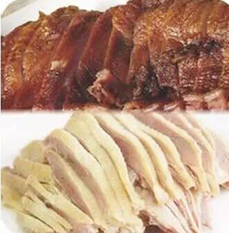 2、炒锅放旺火上,下油烧五六成热时,投入烤鸭,入油炸至皮脆肉熟,捞出沥干油,用小刀将鸭皮连鸭肉片下,切成片装盘内;