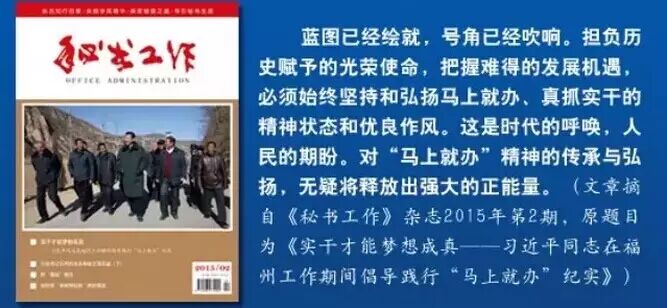 《秘书工作》杂志2015年第2期刊发重磅文章《实干才能梦想成真——习近平同志在福州工作期间倡导践行“马上就办”纪实》。文章分为“雷厉风行 紧抓快办”“民有所呼 我有所为”“办就办成 滴水穿石”“迎难而上 敢于担当”“长效常态 弘扬传承”五大部分,全文长达1万2千余字。文章独家披露了习近平同志主政福州期间的很多故事和细节,客观呈现出习近平同志一以贯之的“真抓实干、马上就办”工作作风。