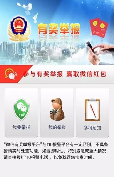 江西省公安厅依托微信服务平台,推出覆盖全省公安机关的微信有奖举报。微信用户通过关注“江西公安办事大厅”微信服务号或“江西公安”微信公众号,实名注册登录后即可进入举报界面。公安机关对举报有功人员以微信红包形式予以奖励,最高奖励100元。