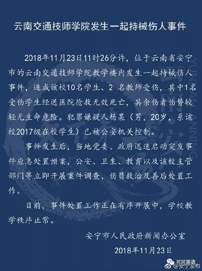 周五中午左右,云南省安宁市一所学院的一名学生制造袭击案,造成12人受伤。据当地政府通报,其中一名伤者经送医院抢救无效死亡。