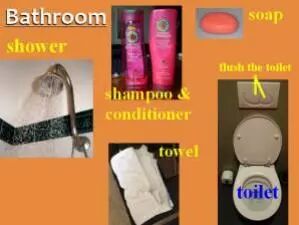 In the bathroom, you can also take a shower(淋浴). You use shampoo(洗发水) and conditioner(护发素) to wash your hair, and soap(香皂) to wash your body. Then you use a towel(毛巾) to dry off. Of course, you can also use the toilet(马桶) – and don’t forget to flush(冲水) the toilet after you’re finished!
