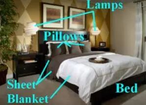 Let's begin with the bedroom(卧室). The bed(床) is the place where you sleep - probably with pillows(枕头), sheets(床单), and blankets(毛毯). In this photo, there are two lamps(台灯) next to the bed.