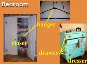 You keep your clothes in a closet(衣柜) - on hangers(衣架) - or in a dresser(化妆柜) - inside the drawers(抽屉).