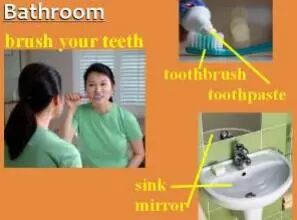 Now we'll learn about the bathroom. In the bathroom, you can brush your teeth(刷牙) using a toothbrush(牙刷) and toothpaste(牙膏). Most people use the sink(水槽) to brush their teeth, and in this photo, the woman is looking in the mirror(镜子).