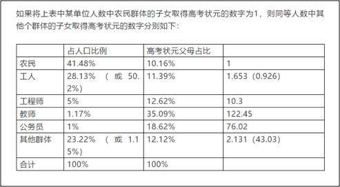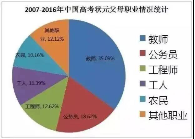 来自教师家庭的占总数的35.09%; 其次是公务员家庭,占18.62%; 工程师家庭占12.62%; 工人家庭占11.39%; 农民家庭占10.16% 其余为医生、律师、金融、证券、财务等职业家庭。